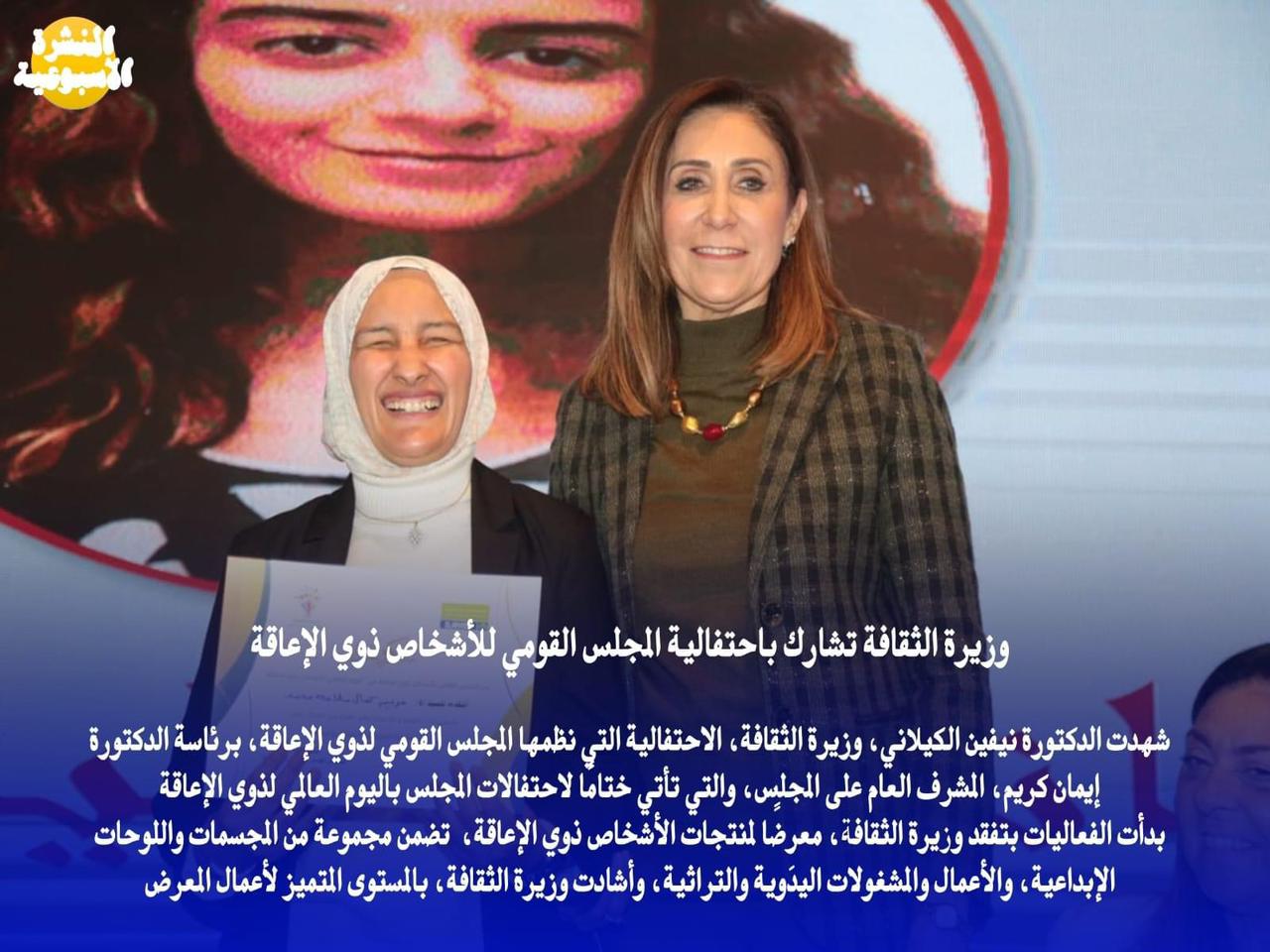 شهدت الدكتورة نيفين الكيلاني، وزيرة الثقافة، الاحتفالية التي نظمها المجلس القومي لذوي الإعاقة، برئاسة الدكتورة إيمان كريم، المشرف العام على المجلس، والتي تأتي ختامًا لاحتفالات المجلس باليوم العالمي لذوي الإعاقة.