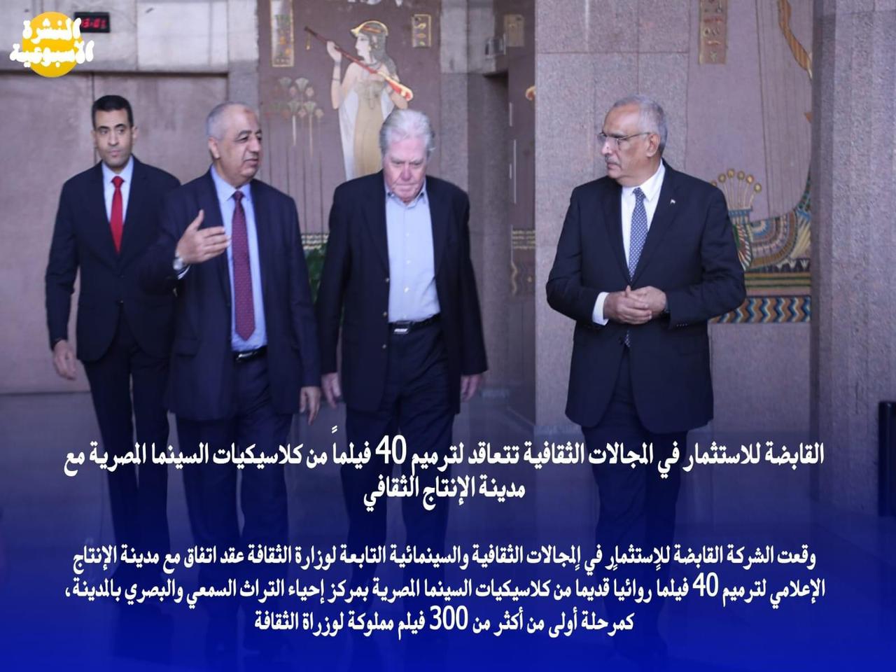 وقعت الشركة القابضة للاستثمار في المجالات الثقافية والسينمائية التابعة لوزارة الثقافة عقد اتفاق مع مدينة الإنتاج الإعلامي لترميم 40 فيلماً روائياً قديماً من كلاسيكيات السينما المصرية بمركز إحياء التراث السمعي والبصري بالمدينة، كمرحلة أولى من أكثر من 300 فيلم مملوكة لوزراة الثقافة.