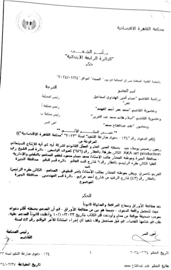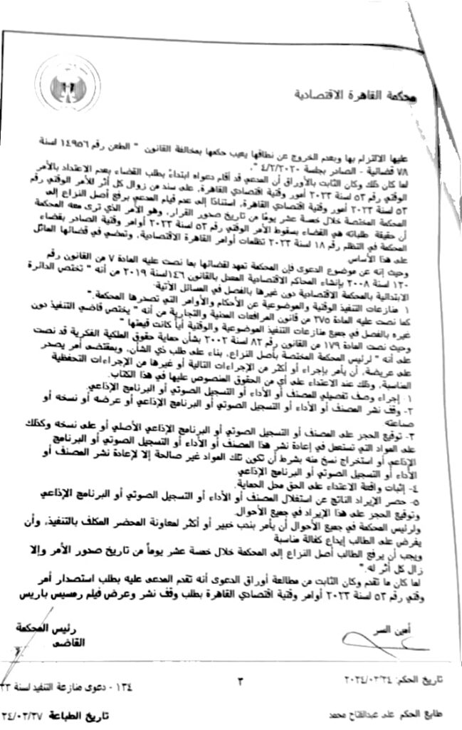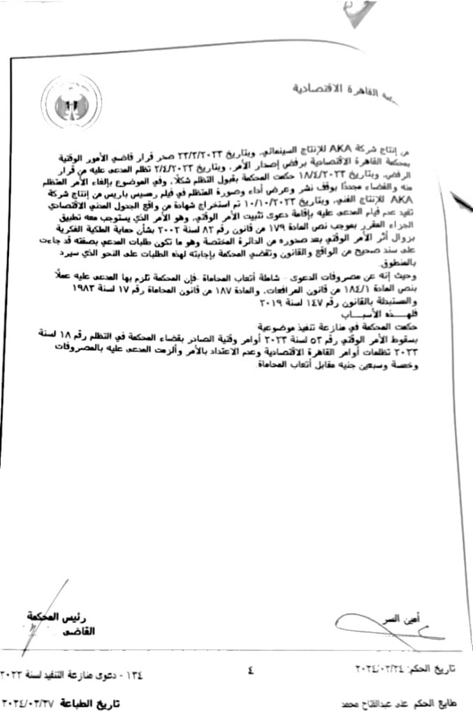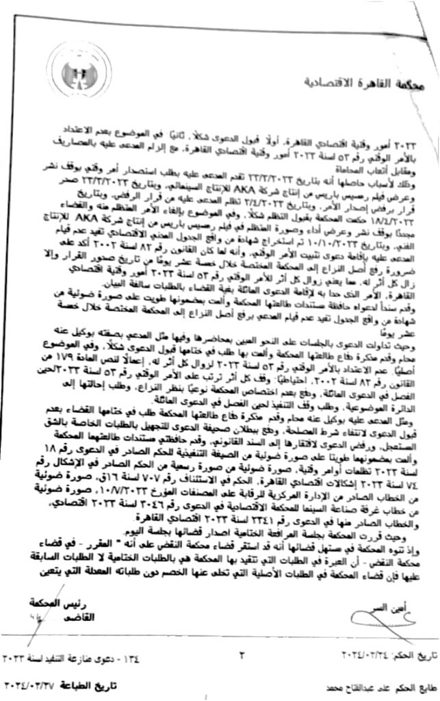 كما أصدرت المحكمه بسقوط الأمر الوقتي رقم ٥٣ لسنه ٢٠٢٣ الصادر بقضاء المحكمة في التظلم رقم ١٨ لسنه ٢٠٢٣ بعدم الاعتداء بالأمر وحق عرض العمل الفني بجميع المنصات والتطبيقات كما يحق للشركه المنتجه ولا يحق لأي شخص او اي جهه بوقف عرض الفيلم.
