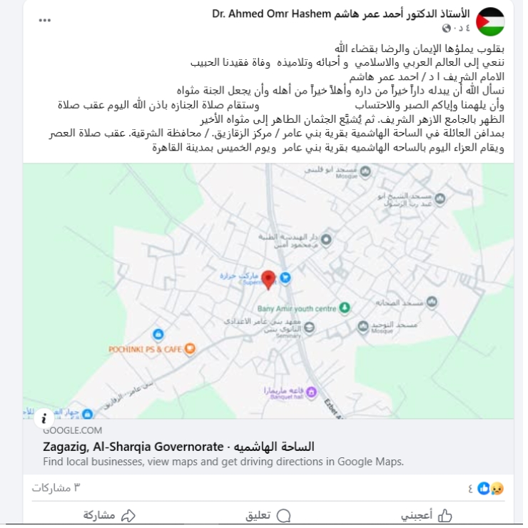 وجاء في بيان النعي المنشور على الصفحة الرسمية: بقلوب يملؤها الإيمان والرضا بقضاء الله، ننعي إلى العالم العربي والإسلامي وأحبائه وتلاميذه وفاة فقيدنا الحبيب الإمام الشريف أ.د. أحمد عمر هاشم، نسأل الله أن يبدله دارًا خيرًا من داره وأهلًا خيرًا من أهله وأن يجعل الجنة مثواه.