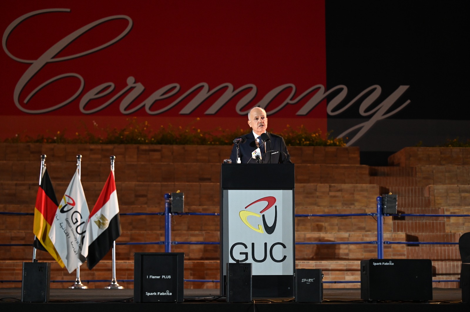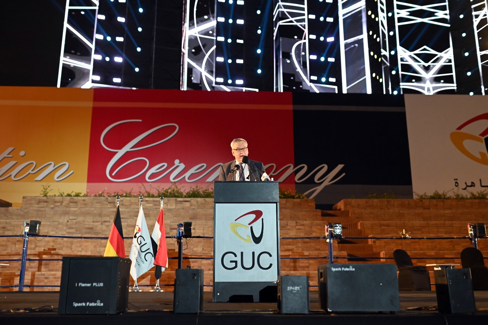 و القي الدكتور أشرف منصور كلمة بهذه المناسبة مرحباً بالحضور مهنئاً اولياء أمور الخريجين ، مقدماً الأمتنان لشركاء النجاح من وزارة التعليم العالى المصرية ووزارة الخارجية المصرية و الحكومة المصرية ، و السفارة الالمانية بالقاهرة و الهيئة الالمانية للتبادل العلمي DAAD ووزارة الخارجية الالمانية و الوزارة الاتحادية للبحث والتكنولوجيا والفضاء BMFTR و الجامعات المؤسسة و أعضاء البرلمان المصري و الالماني ، حيث تعاونت المؤسسات و الوزارات و الجامعات بتشكيل فريق عمل ضم مجموعة من الأفراد يتمتعون بمهارات تكاملية فيما بينهم سعوا لتحقيق هدف مشترك واضح ومحدد ونجحوا في التخطيط والتنفيذ لهً حتى أصبحت الجامعة الالمانية بالقاهرة اكبر جامعة المانية عابرة للحدود.