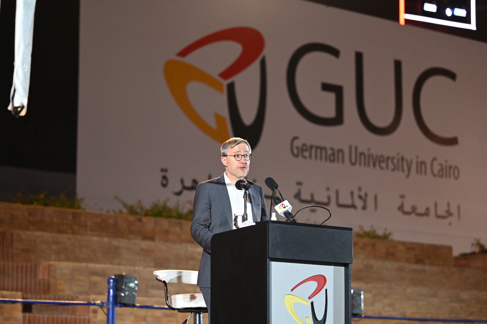 أكد السيد يورجن شولتس، سفير جمهورية ألمانيا الاتحادية بالقاهرة بأن الجامعة الألمانية بالقاهرة تُعد نموذجًا رائدًا وناجحًا لهذا التعاون الوثيق بين البلدين، الذي يثمر بشكل مستمر نتائج قيّمة تمتد آثارها الإيجابية لتخدم مصر وألمانيا والعالم أجمع، معربًا عن شكره وتقديره للأستاذ الدكتور أشرف منصور مؤسس الجامعة، على رؤيته الطموحة التي أصبحت واقع ملموس يلهم الاجيال القادمة من الطلاب والباحثين والمهنيين ، ومؤكدًا أن مشاركته في هذا الحدث تعكس عمق الشراكة الحيوية التي تجمع بين مصر وألمانيا في مجالات التعليم والعلوم والبحث العلمي.