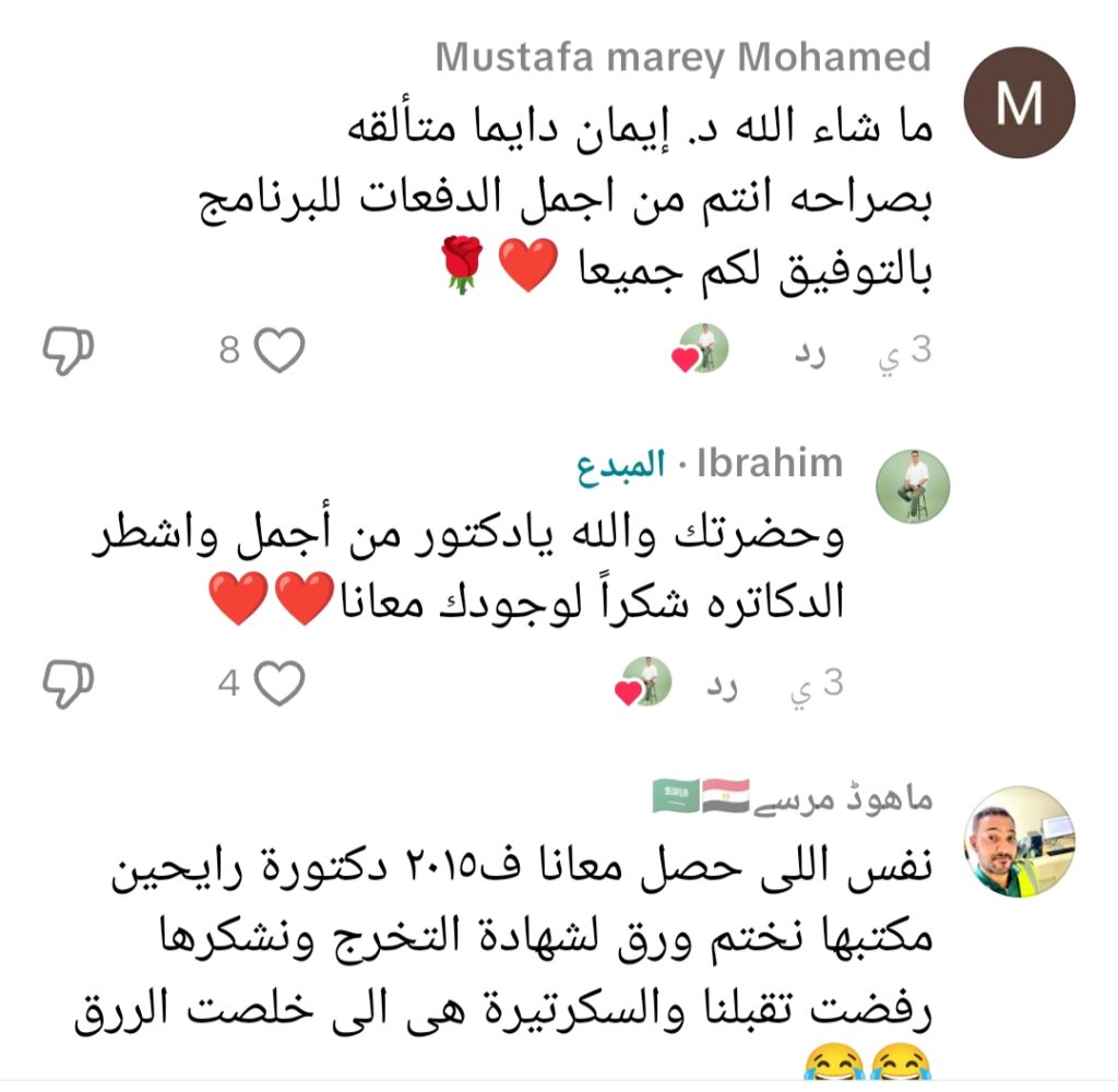 وعلق أيضًا عدد كبير من الطلاب على الفيديو المتداول حول تكريم الدكتورة إيمان، مؤكدين أنها تستحق أكثر من ذلك نتيجة تعبها معهم طوال فترة دراسة الطلاب بالبرنامج، وأن هذا التكريم أقل ما يمكن أن نقدمه لها، متمنين لها المزيد من التقدم والازدهار.