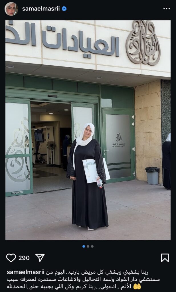 وكتبت سما المصري عبر حسابها الشخصي بموقع إنستجرام: “ربنا يشفيني ويشفي كل مريض يارب..اليوم من المستشفي ولسه التحاليل والاشاعات مستمره لمعرفه سبب الألم… ادعولي…ربنا كريم وكل اللي يجيبه حلو.. الحمدلله”.