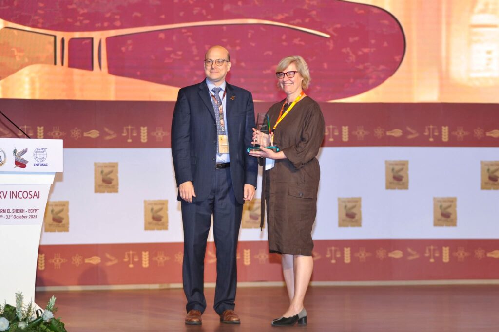 تلتها جائزة “إلمار بي. ستاتس” (Elmer B. Staats Award) التي تمنحها المجلة الدولية للمراجعة الحكومية لأفضل ورقة بحثية منشورة، حيث فاز بها عضوا الجهاز الأعلى للرقابة بجمهورية لاتفيا، سيلفيا نورا كالنينز وأجنيس جونزيم، عن دراستهما المعنونة “Think Big: A New Approach for Recommendations” المنشورة في الربع الثالث من عام 2024، والتي تميزت بالأصالة والإبداع والمساهمة الفكرية العميقة في تطوير المهنة الرقابية.