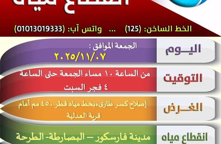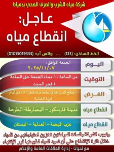 أعلنت شركة مياه الشرب والصرف الصحي بدمياط ، بقيادة مجدي عطا الله ، رئيس مجلس الإدارة والعضو المنتدب ، عبر صفحتها الرسمية ، على موقع التواصل الاجتماعي ، الفيس بوك ،عن انقطاع مياه الشرب اليوم الجمعة ، من الساعة العاشرة مساءاً حتى الرابعة فجر يوم السبت ، عن عدة قرى ومدن : فارسكور ، الطرحة ، البصارطة ، عزب النهضة ، العدلية والبستان .