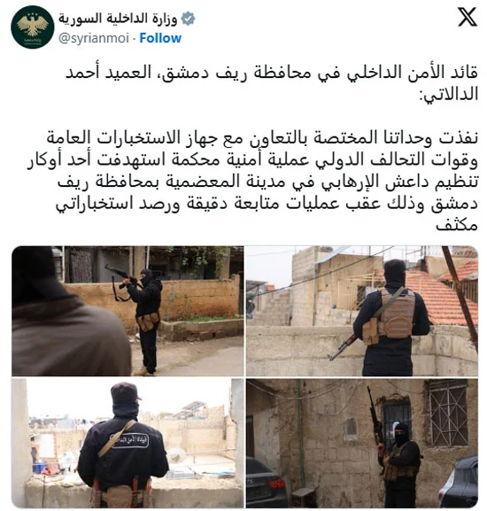 من جهته، قال العميد أحمد الدالاتي قائد الأمن الداخلي في محافظة ريف دمشق، في تصريح له أوردته وزارة الداخلية عبر حسابها بمنصة “إكس”: “نفذت وحداتنا المختصة بالتعاون مع جهاز الاستخبارات العامة وقوات التحالف الدولي عملية أمنية محكمة”.