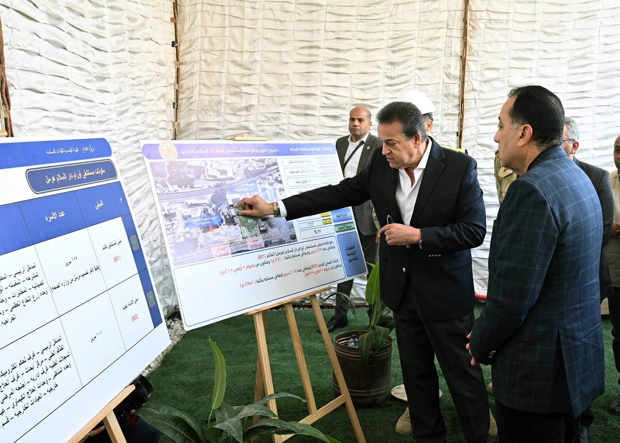 وخلال الجولة التفقدية في أرجاء المستشفى، تعرف رئيس الوزراء على مستجدات الموقف التنفيذي لأعمال مشروع تطوير ورفع كفاءة مستشفى أورام دار السلام ( هرمل سابقا)، حيث أشار مسئولو إدارة الأشغال العسكرية إلى أن مكونات مشروع التطوير تتضمن رفع كفاءة مبنى مستشفى أورام دار السلام القائم بالفعل بإجمالى 129 سريرا، بإجمالى مساحة بنائية نحو 25 ألف م2، ويتكون المبنى من بدروم وأرضى بالإضافة إلى 6 أدوار متكررة، كما يتضمن مشروع التطوير إقامة مبنى جديد بطاقة 108 أسرة، بإجمالى مساحة بنائية 28.5 ألف م2، ويتكون المبنى من بدروم وأرضى بالإضافة إلى 9 أدوار متكررة.