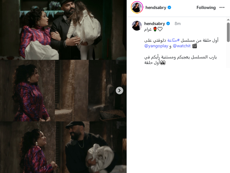 ونشرت هند، عبر حسابها على انستجرام، صورا من الحلقة الأولى للمسلسل، صحبتها قائلة: “غرام.. يارب المسلسل يعجبكم ومستنية رأيكم في أول حلقة”.