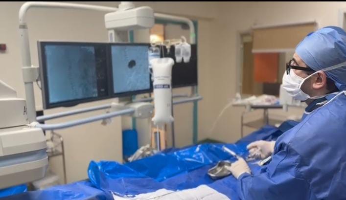 وعلى الفور، تقرر إجراء قسطرة علاجية دقيقة، حيث تم إدخال قسطرة عبر الشريان الفخذي وتوجيهها باستخدام تقنية التصوير الوعائي (Angiography) لتحديد مصدر النزيف بدقة.