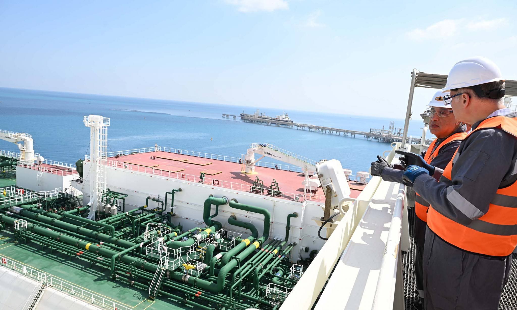 وخلال ذلك، صعد رئيس الوزراء إلى وحدة التغويز حتى وصل لنقطة المشاهدة المطلة على السفينة المحملة بشحنة الغاز المسال؛ لمتابعة إجراءات عملية التغويز.